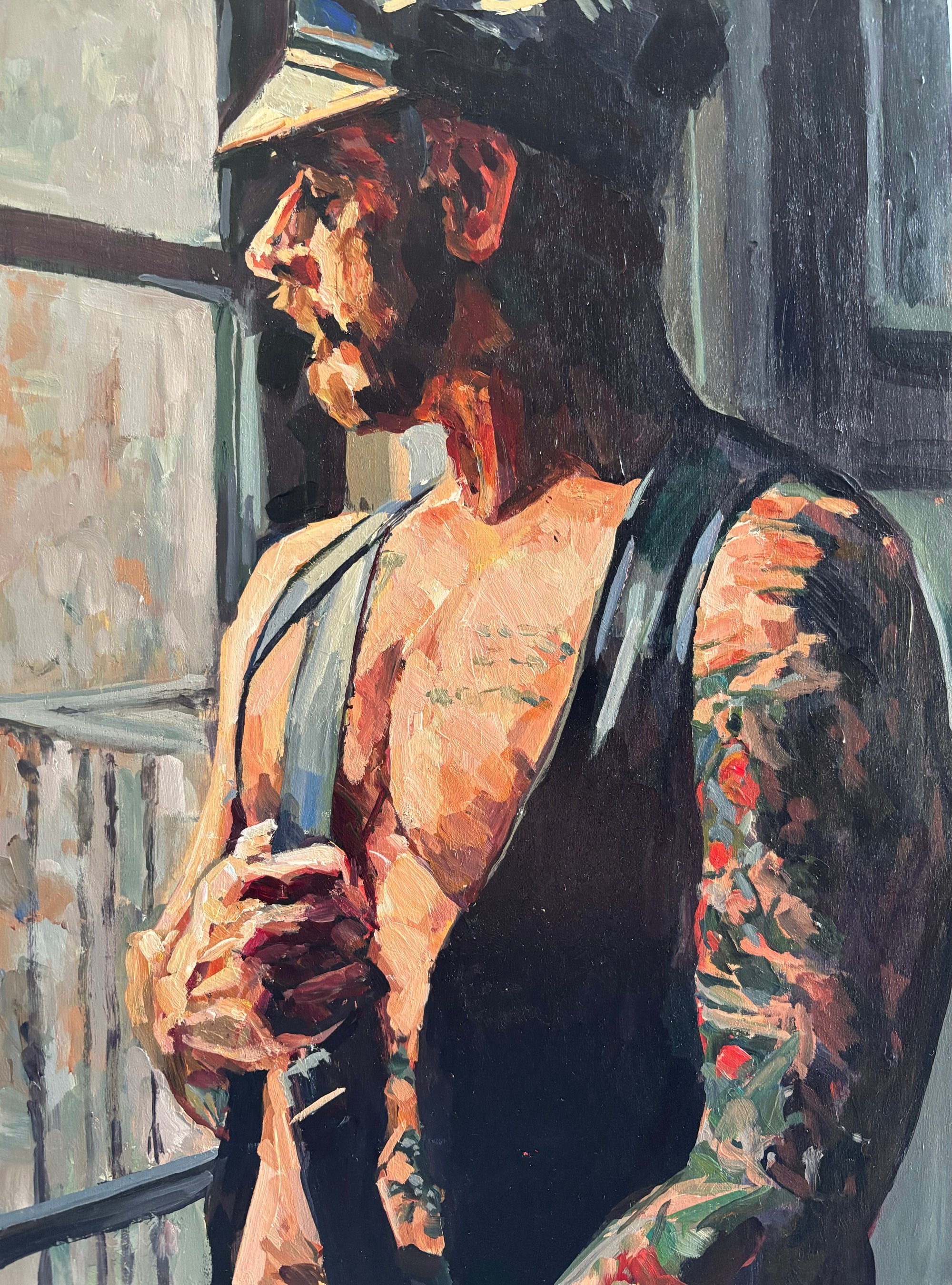 Acrylic painting on board Portrait in three quarter profile of a tattooed leatherman looking out of a window 30cm x 40cm Unframed
