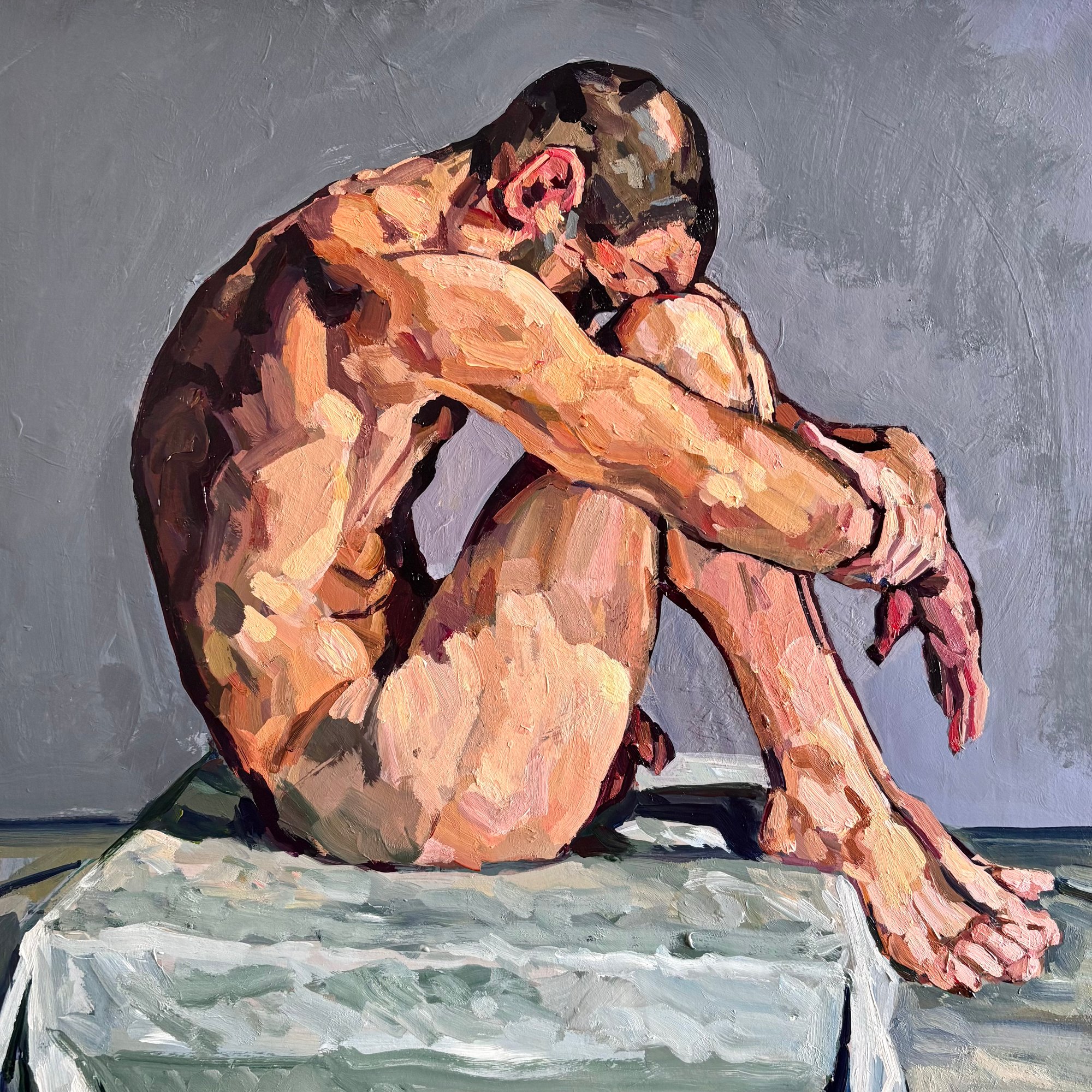 Acrylic painting on board Portrait in profile of a male nude, knees raised and head resting on his knees. %0cm x 50cm Unframed