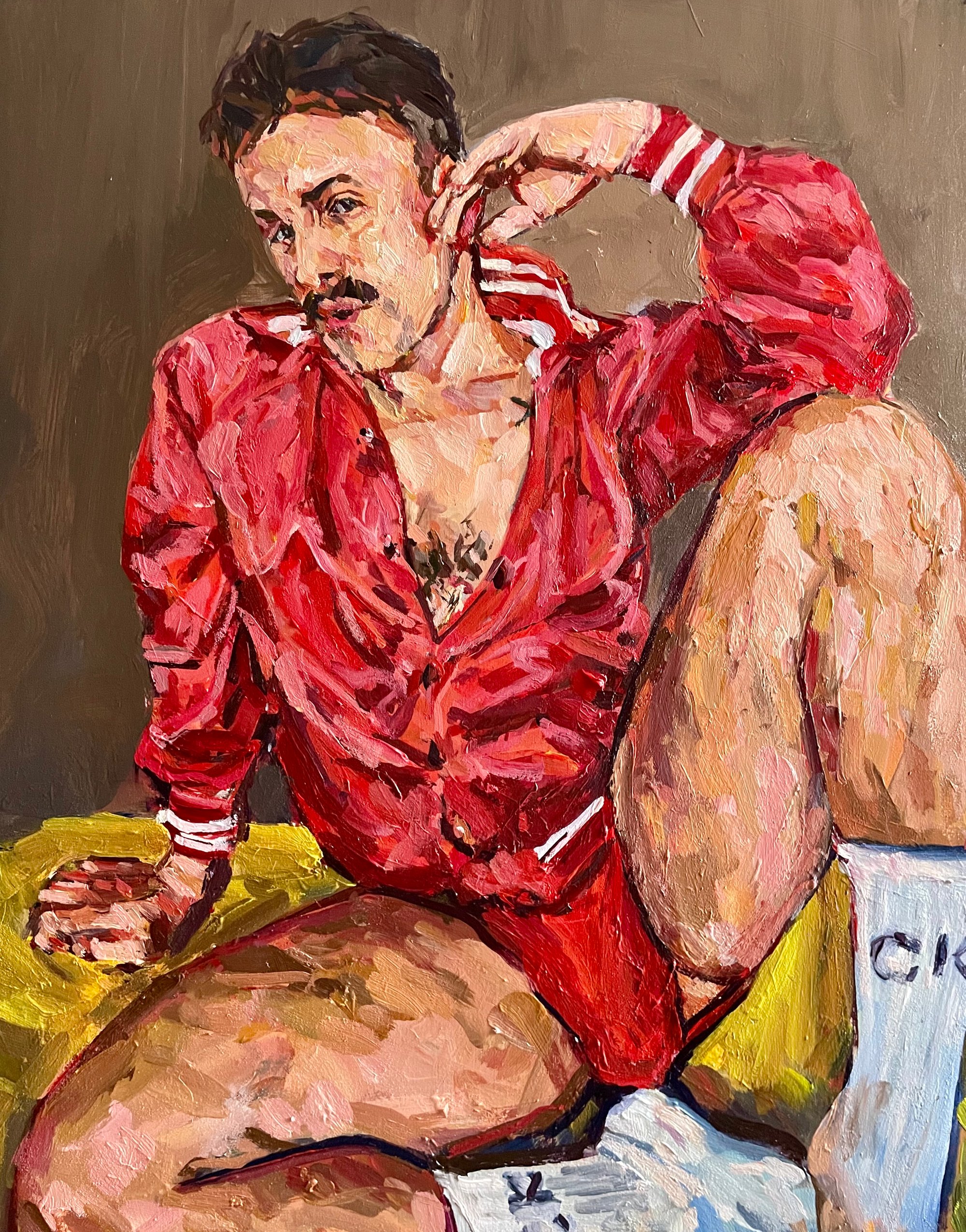 Acrylic painting on panel Portrait of a gay man head, in a red jacket, jockstrap and white sports socks 40cm x 50cm framed dimensions 45cm x 55xm
