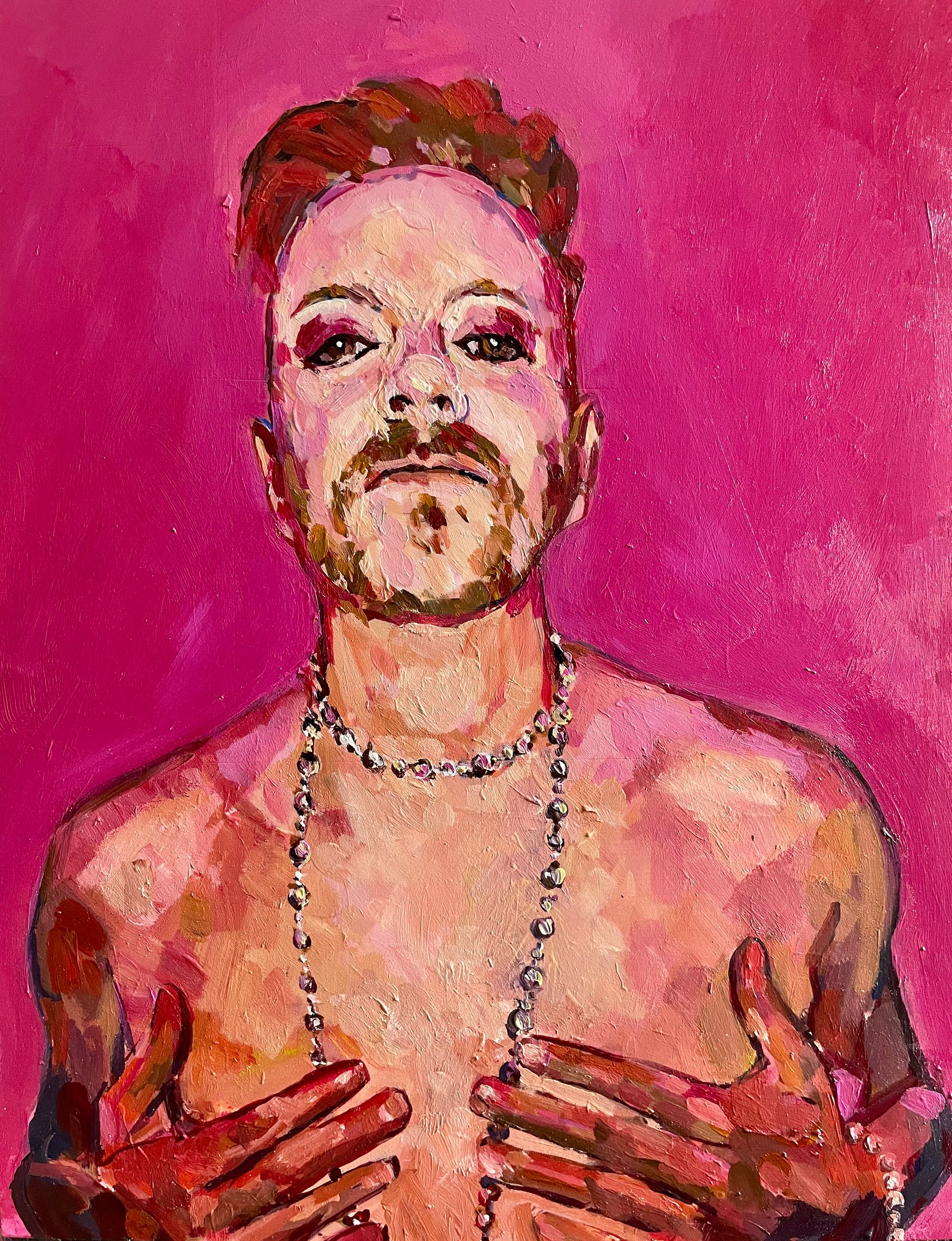 Acrylic painting on panel Portrait of a young gay man head, shoulders and torso against a pink background 30cm x 40cm framed