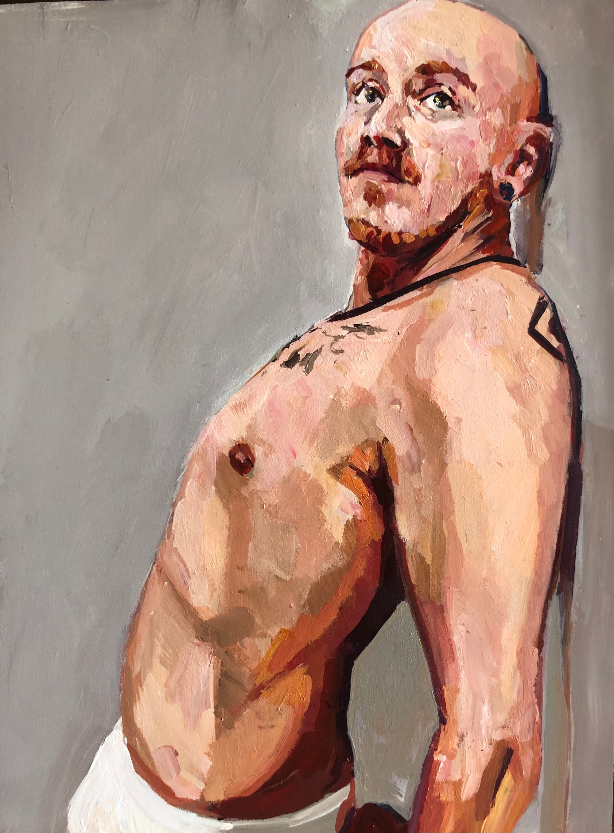 Acrylic painting on board Portrait of a young gay man head, shoulders and torso, tside on wearing white underwear 23cm x 30cm unframed