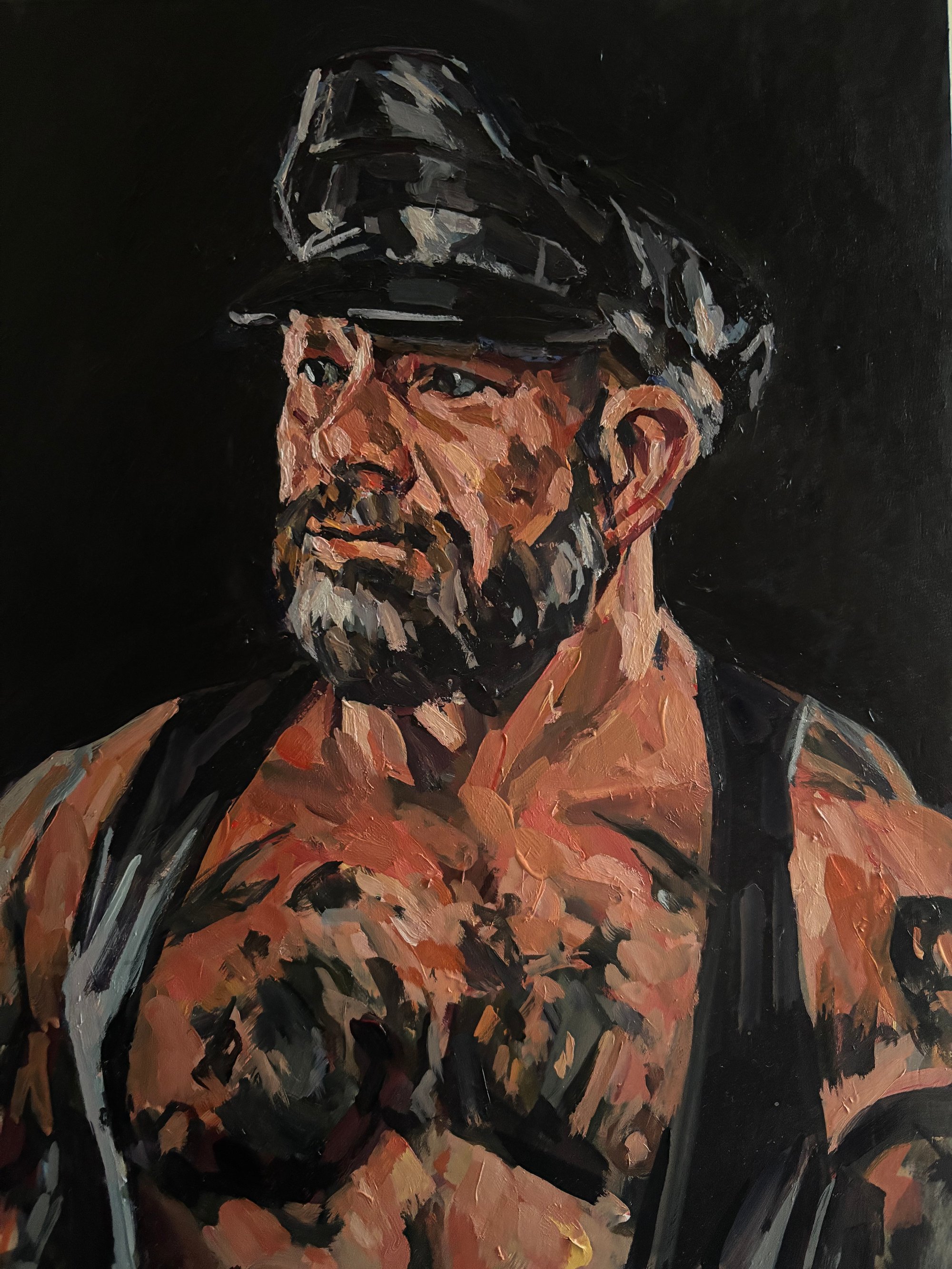 Acrylic painting on board Portrait in three quarter profile of a tattooed leatherman 30cm x 40cm Unframed