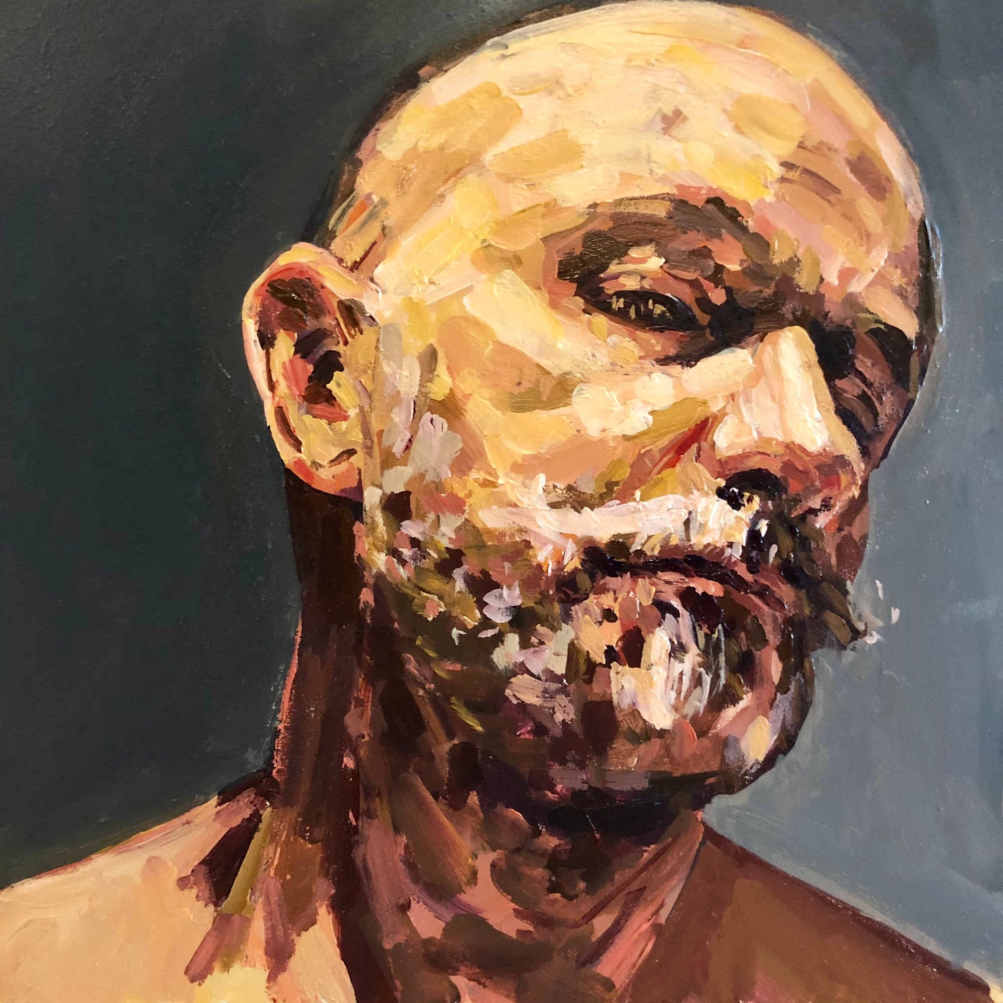 Acrylic painting on panel Self Portrait head, lit by dramatic light 30cm x 30cm framed dimensions 35cm x 35cm
