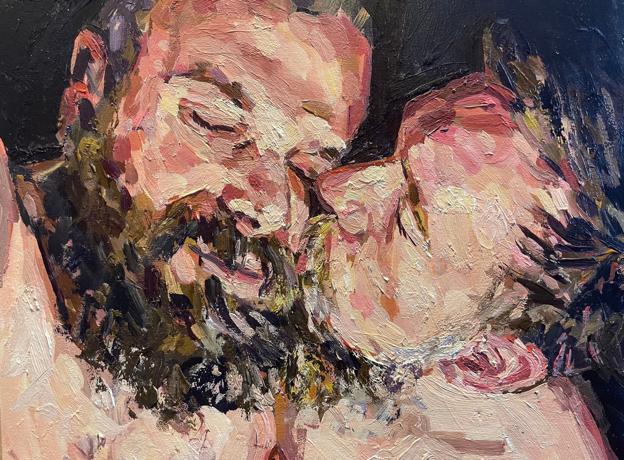 small acrylic painting on panel of two beared men one kissing the cheek of the other. 20cm x 25cm Framed 25cm x 30cm